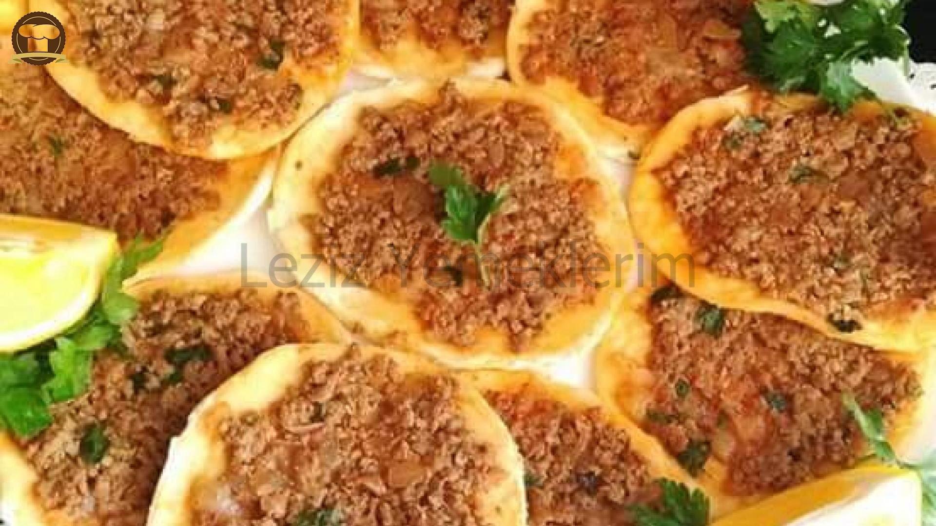 Hamurumuzun malzemelerini karıştırıp yavaş yavaş unu koyup ele yapışmayan bir hamur elde ediyoruz.Küçük mandalina kadar bezeler yapıp ince bir şekilde unlayarak açıyoruz. Açtığımız hamurumuzu yuvarlak bir kase yada demlik kapağıyla kesip yuvarlak lahmacun hamurlarımızı orta ateşte yağsız tavaya koyup biraz pişince tersini çevirip üzerine iç harcımızdan koyup düzeltiyoruz. Altı pembeleşince servis tabağımıza alıp diğerlerinede aynı şekilde pişiriyoruz.