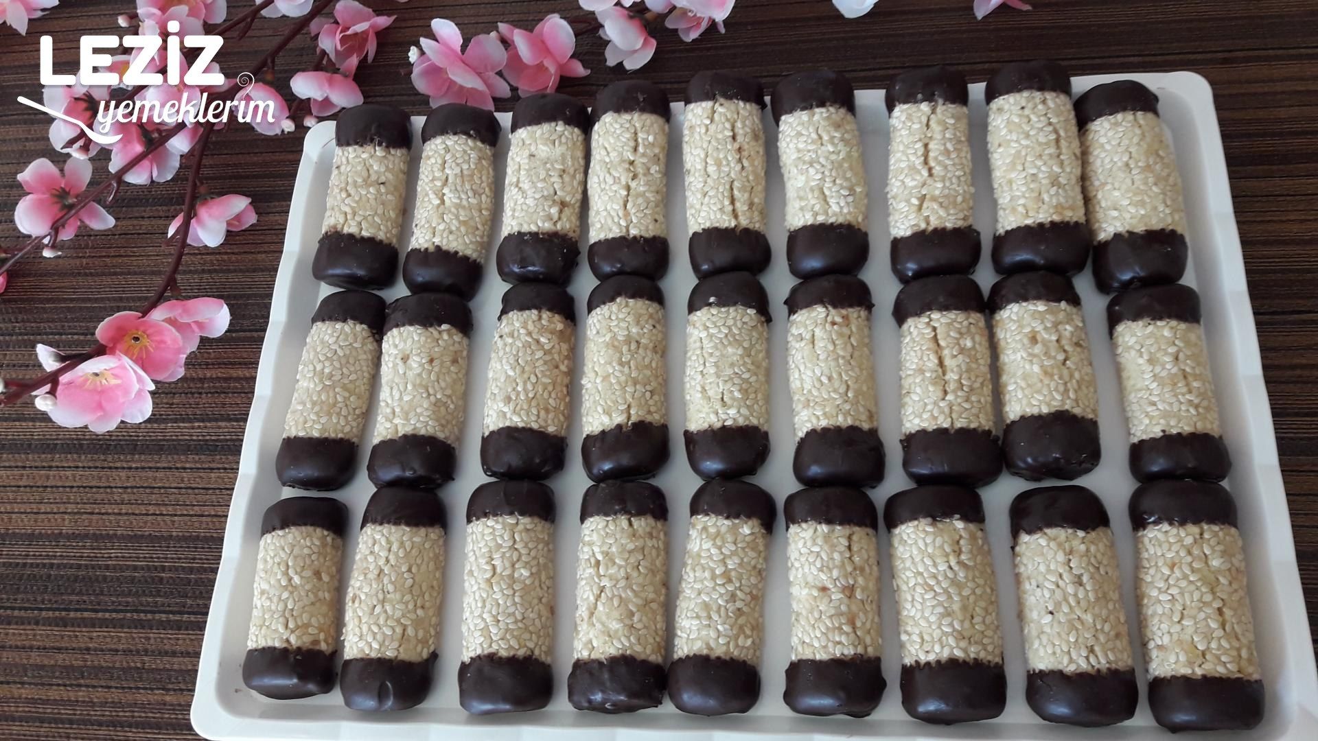 Tezgaha veya uzunca bir tepsiye hamurun uzunluğunda susam dökelim ve hamurumuzu susama hafifçe yuvarlayarak her yerine bulayalım ve istediğimiz boyutta parçalar keserek yağlı kağıt serili tepsiye dizelim.
