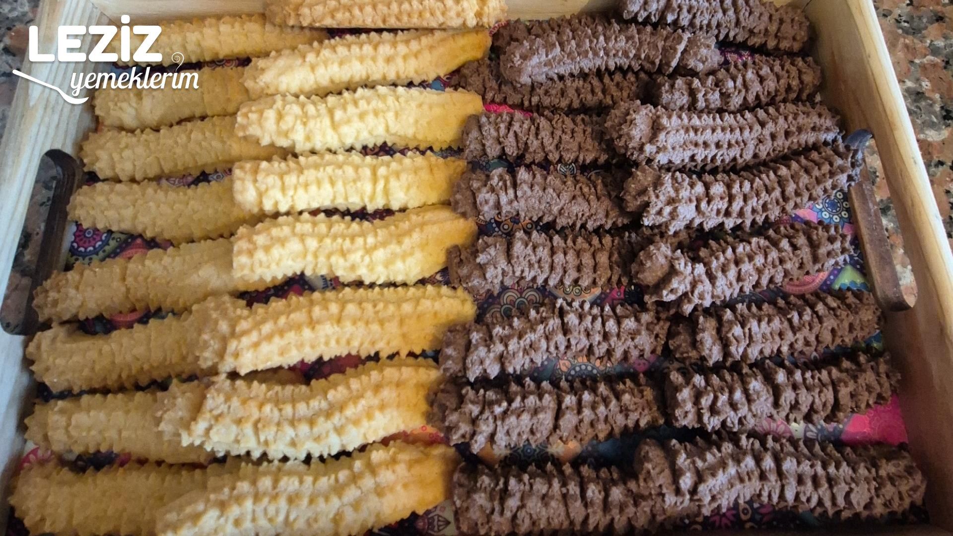 Tırtıl kurabiye aparatını içine hamuru koyuyoruz ve parmağımızla bastırarak tepsiye alıyoruz
